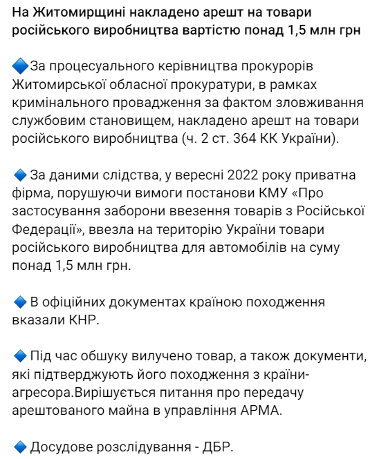 За процесуального керівництва прокурорів Житомирської обласної прокуратури, в рамках кримінального провадження за фактом зловживання службовим становищем, накладено арешт на товари російського провадження (ч. 2 ст. 364 КК України). Під час обшуку вилучили товар та документи, що підтверджують його походження з РФ. Вирішується питання передачі арештованого майна до управління АРМА.