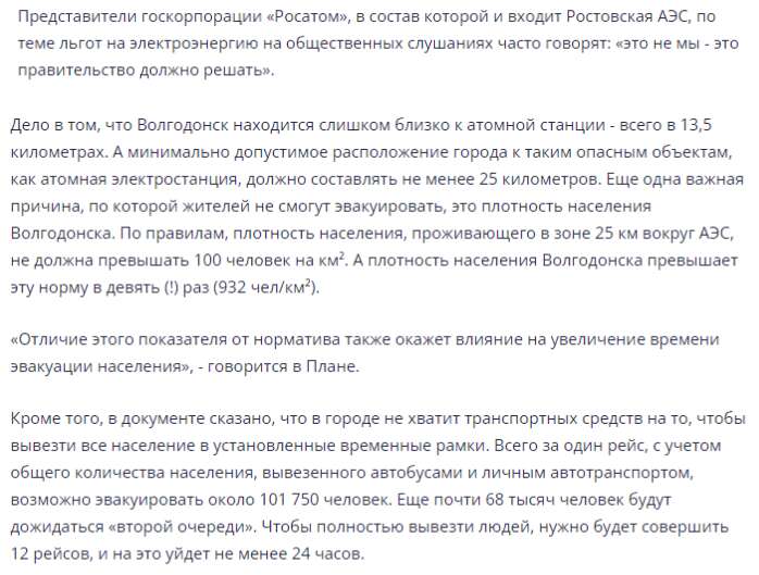 Дозволю собі ще одне цитування виступу голови міської Громадської палати Ростовської області Віктора Стадникова, але у перекладі, щоб читачу було зрозуміло: «Жителі міста Волгодонська Ростовської області у разі аварії на Ростовській АЕС фактично опиняться у блокаді. Це пов’язано з транспортною доступністю. У разі аварії на атомній станції ми просто не встигнемо евакуювати мешканців міста. Ми не маємо поїздів — ми залишилися без залізничного вокзалу, без порту. Закрили аеропорт. Досі не збудовано третій міст, який обіцяли ще кілька років тому. Єдина автомобільна 25-ти километрова траса у бік Ростова у жахливому стані».