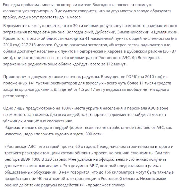 Як я нарахувала по моніторингу соцмереж Ростовської області, про аварії чи загибель людей на Ростовській АЕС, що знаходиться у місті Волгодонськ, писали 4 рази за минулий рік. Кожен раз це була пожежа, тріщина чи зупинка та загибель одного чи кілька осіб, бо це ж приховувалося.