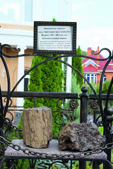 Напротив главного входа в опечатанный дом стоит фонтан, до боли похожий на тот, что стоял когда-то в Киеве на Золотых Воротах, а потом был взят «на реставрацию». На мраморном столике под специальным козырьком, словно икона, хранится раритет: кусок окаменелого дерева. Рядом таблица, будто бы из музея: «Араукария. Возраст: 290–300 млн лет. Каменноугольный период».