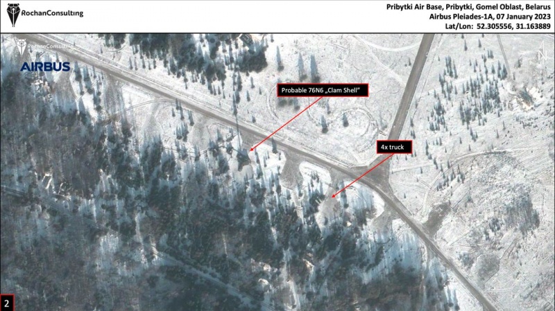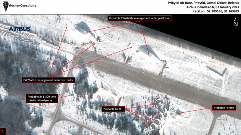 На свіжих фото аеродрому "Зябрівка" у Гомельській області можна помітити дивізіон з 9 одиниць зенітно-ракетних комплексів С-300/400, які знаходяться там уже тривалий час. Крім того, там розміщено ЗРПК "Панцир", який стоїть на насипу ґрунту, вантажні машини, а також кілька радарів, котрі Rochan Consulting визначив як 76N6 та 64N6E.