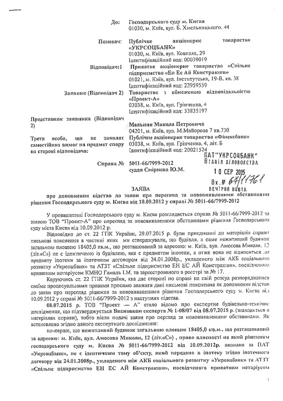 Часть таких исков и обращений подготовил как раз Николай Мельник. В частности, по вновь выявленным обстоятельствам «Проект А» просит Хозяйственный суд г. Киева не признавать право собственности на «башни» за «Укрсоцбанком» поскольку изначально переданный в ипотеку объект (под который брался кредит) и полученный в результате – якобы неидентичны.