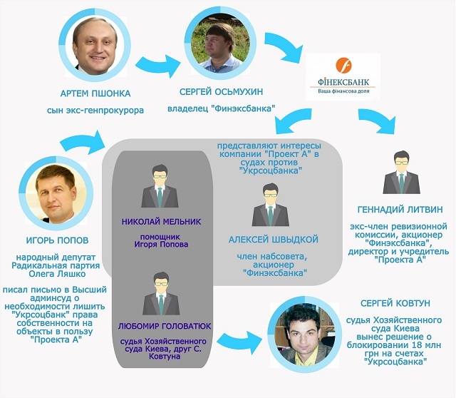 Подтверждением непосредственного интереса владельца Финэксбанка в положительном решении споров с«Укрсоцбанком» является участие его менеджеров – Геннадия Литвина (экс-член ревизионной комиссии, акционер банка) и Алексея Швыдкого (член набсовета, акционер банка) в функционировании «Проекта А». Литвин является номинальным директором и учредителем компании, а Швыдкой представляет его в уголовных делах. По сути – с таким же статусом, как и Николай Мельник.