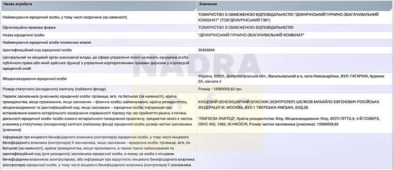В Єдиному державному реєстрі юридичних осіб, фізичних осіб-підприємців та громадських формувань (ЄДР) кінцевим бенефіціарним власником ДемГЗК вказаний Михайло Шелков, здійснюючи контроль через кіпрську Limpieza Limited, яка володіє 100% капіталу комбінату: