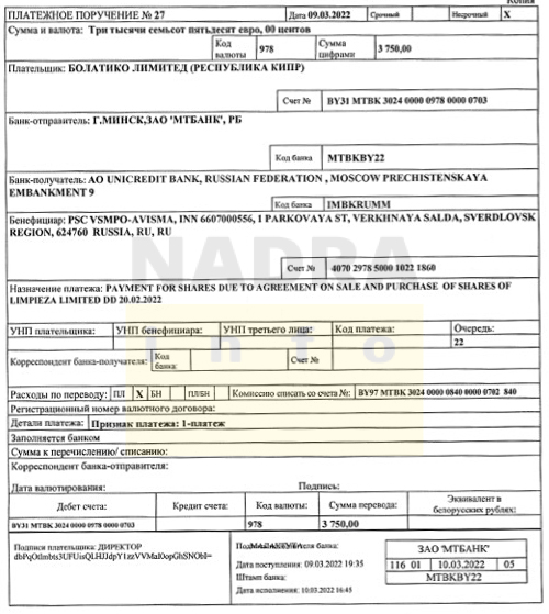 Зрештою, від власного джерела NADRA.INFO вдалося отримати копію платіжного документу, на підставі якого, імовірно, Bolatico Limited заплатила ВСМПО-Авісма за акції. Джерело підтверджує, що транзакцію проводив білоруський банк МТБанк: