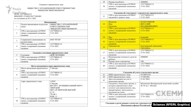 Власник «ВТЭК» – Віталій Володимирович Колесников, громадянин України. І хоча у реєстрі не вказано жодних додаткових даних щодо цієї особи, «Схеми» встановили, що це саме той Віталій Колесников, якого затримали під час передачі хабаря голові Фонду держмайна.