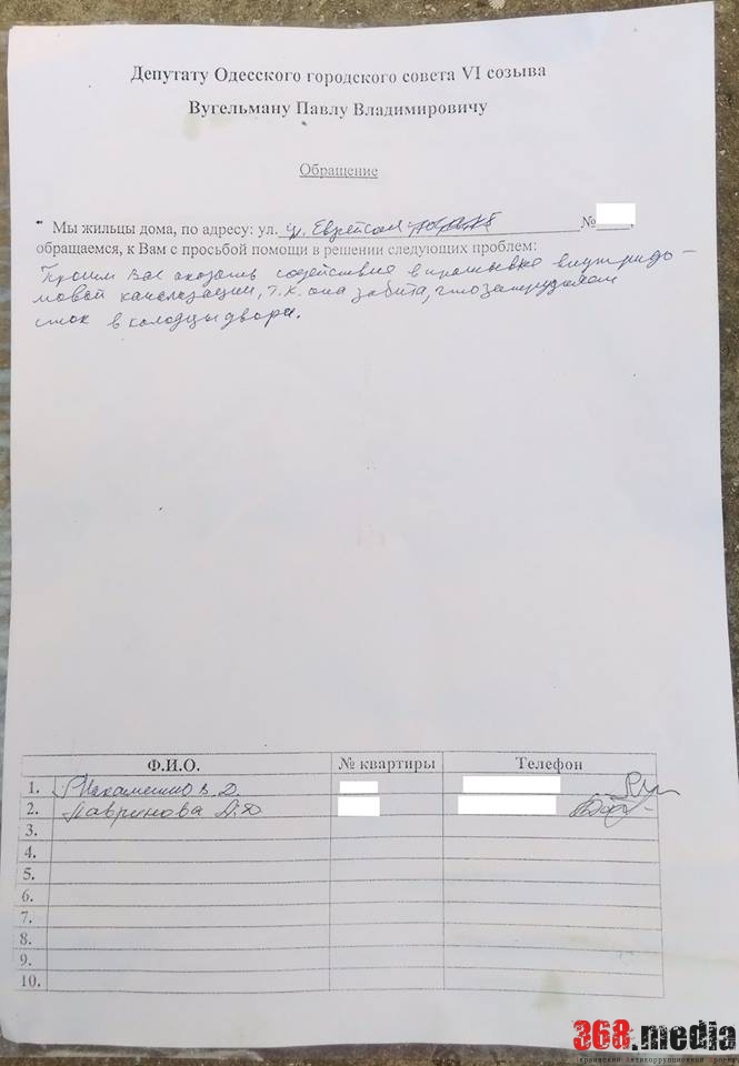«Пару недель назад пенсионер обратился с заявлением в участок №6 ЖКС «Порто-Франковский» с просьбой прочистить домовую канализацию в доме по ул. Еврейской. Сотрудник ЖЭКа заявление принял, но заявил, что делать ничего не будут, а если пенсионер хочет, чтобы ему что-то сделали, он должен обратиться к депутату горсовета Павлу Вугельману и тут же, в ЖЭКе выдал бланк обращения к депутату», – пояснил он.
