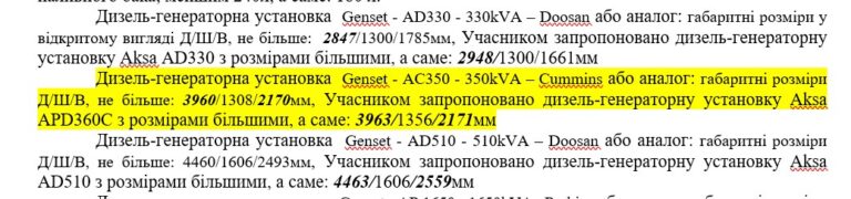 Наприклад, замовник вимагав генератор Genset – AC350 – 350kVA – Cummins або аналог розмірами не більше 3960/1308/2170 мм. Проте "Ространс" запропонував трохи більший генератор Aksa APD360C турецького виробництва розмірами 3963/1356/2171 мм.