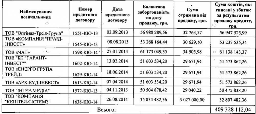 Першим п’ятьом позичальникам з вищезгаданого списку збільшили кредит до 39 млн гривень кожному. «Арх-буд-інвест» підвищили до 31 млн, «Інтер-мєдіа» — до 30,3 млн гривень. Всього банк прокредитував компанії на 255,6 млн гривень. На момент виведення банку з ринку кошти, позичені вказаним фірмам, складали 56,4% кредитного портфеля.