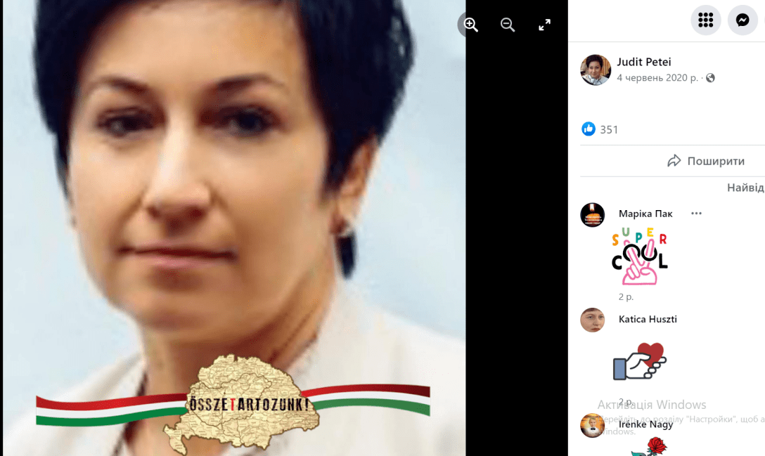 Політик від Партії угорців України Юдіта Петеї опублікувала у Facebook зображення Закарпатської області у кольорах угорського прапора з написом "Боже, бережи Закарпаття", але пізніше його видалила. Після чого нардеп Віктор Балога назвав її "Орбанівською підстилкою".
