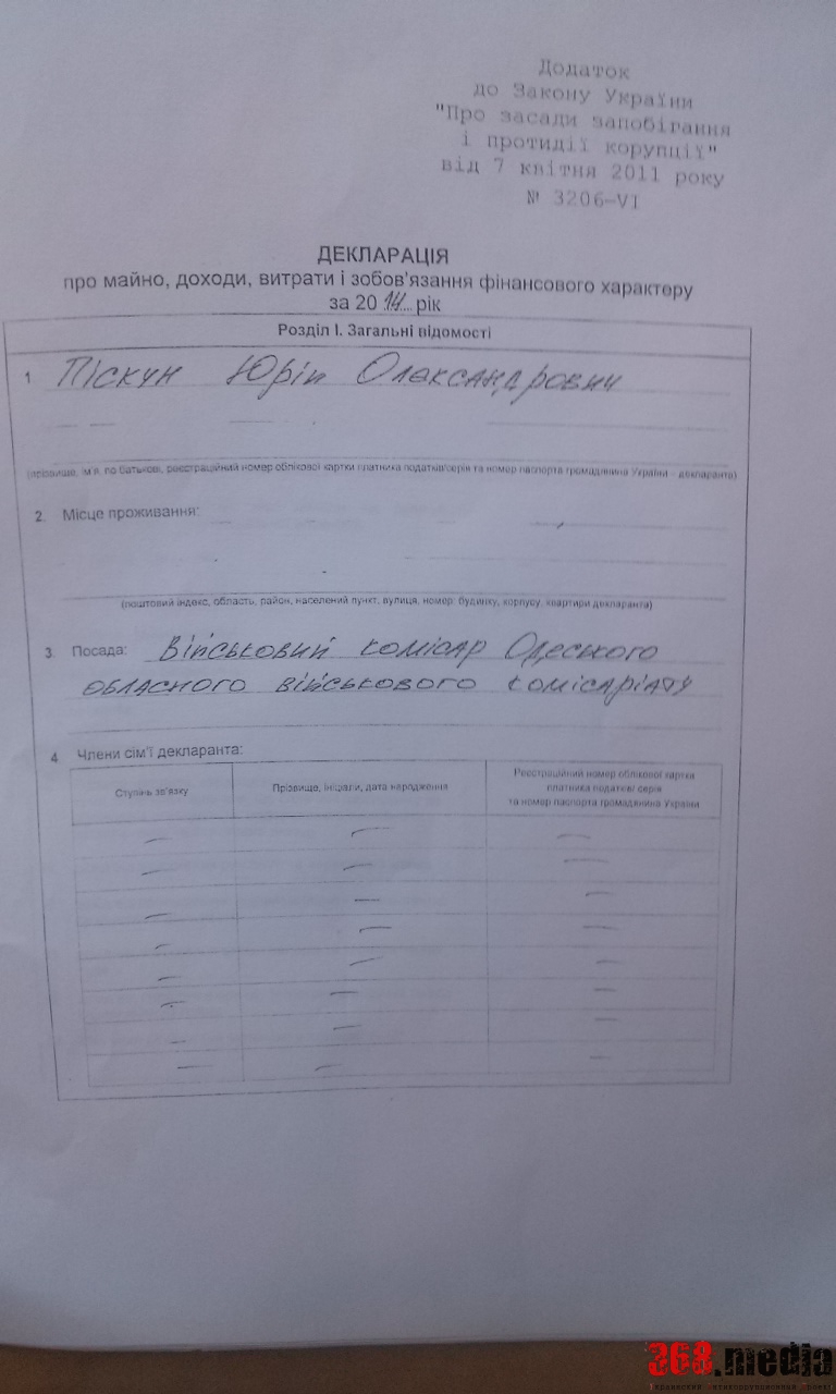 Военком Одесской области Юрий Пискун, который шантажировал призывников. Вымогая у них деньги. Вел роскошный образ жизни, скрывая свои доходы от налоговой службы. Об этом свидетельствуют данные его деклараций, которые редакции 368.media предоставили в Министерстве обороны Украины.