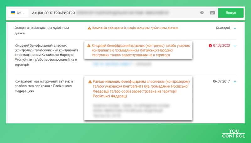 Якщо здійснити поглиблений аналіз розгалужених ланцюжків корпоративної власності, то виявиться, що насправді аж у 10 компаній (а не 5, як це випливає з даних ЄДР) кінцевий бенефіціарний власник (контролер) та/або учасник контрагента є громадянином Китайської Народної Республіки та/або зареєстрований на її території. Ця інформація підсвічується в Експрес-аналізі.