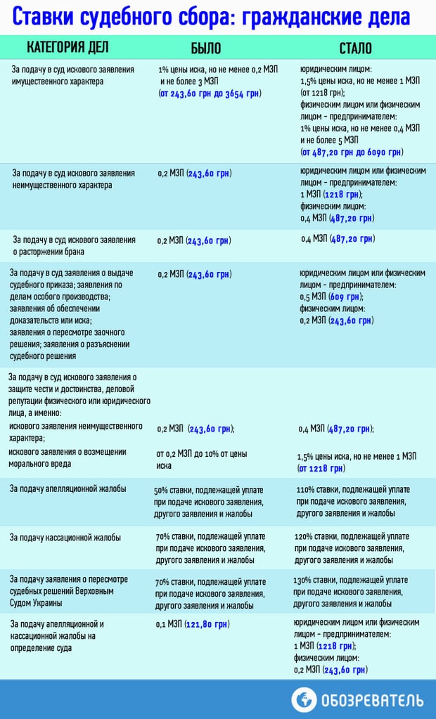 Кроме того, согласно закону, с 1 сентября отменяются льготы по уплате судебного сбора для государственных органов (органов прокуратуры, органов Государственной фискальной службы Украины и др. За подачу исковых заявлений, апелляционных и кассационных жалоб указанные органы будут платить судебный сбор на общих основаниях.