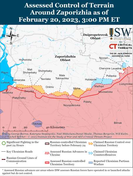 Українські чиновники повідомили, що російські війська продовжують мілітаризацію Запорізької атомної електростанції (ЗАЕС). 20 лютого НАЕК "Енергоатом" повідомив, що російські війська направили до ЗАЕС понад 600 мобілізованих осіб та курсантів та продовжують будівництво фортифікаційних та військових об’єктів навколо сухого сховища відпрацьованого ядерного палива ЗАЕС.