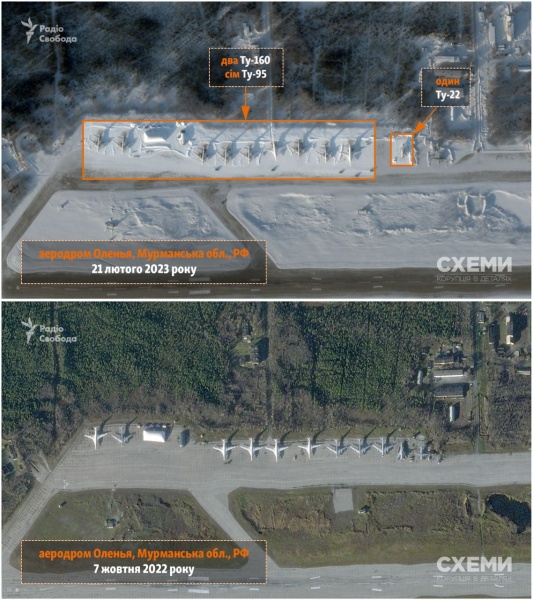 Як зазначають журналісти, порівняно зі знімками за 7 жовтня 2022 року, стратегічних бомбардувальників Ту-95 на аеродромі "Олень" у лютому 2023-го загалом побільшало на 7 одиниць. Всього на аеродромі зараз знаходиться 11 літаків Ту-95, два - Ту-160 та два Іл-78.