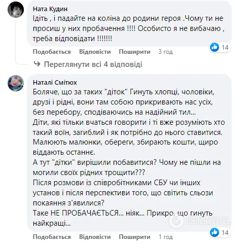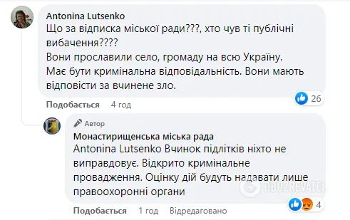 Варто зазначити, що місцеву громаду така заява обурила, про що свідчать коментарі під дописом. Люди сприйняли заяву міської ради, як спробу "зам’яти" справу. Не влаштовують людей і вибачення малолітніх вандалів – вони вимагають суворого покарання для усіх причетних до акту вандалізму, а також для їхніх батьків. Мотиви місцевих жителів зрозумілі: вони переживають, що безкарність породить вседозволеність – і такі випадки будуть повторюватись.