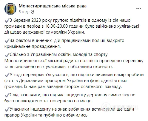 "3 березня 2023 року групою підлітків в одному із сіл нашої громади в період із 18:00-20:00 години було здійснено хуліганські дії щодо державної символіки України. За фактом вчинених дій працівниками поліції відкрито кримінальне провадження. Спільно з Управлінням освіти, молоді та спорту Монастирищенської міської ради та поліцією проведено перевірку та встановлено всіх учасників і обставини скоєного. Під час перевірки з’ясувалось, що підлітки виявили намір зробити фото з Державним прапором України на фоні однієї зі шкіл громади. Їхнім намірам завадив сторож освітнього закладу. Варто зазначити, що під час інциденту державну символіку не було пошкоджено та повернено на місце. Учасники інциденту на знак вибачення встановили ще один прапор України та публічно попросили вибачення!" – йдеться у заяві дослівно.