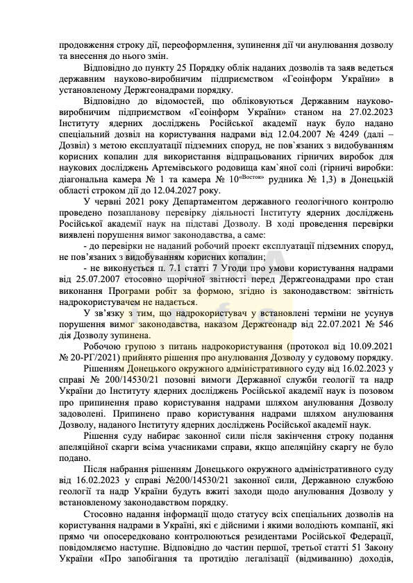 Як саме Інститут ядерних досліджень Російської академії наук використовував гірничі виробки Артемівського родовища кам`яної солі, яка саме діяльність велася на обʼєкті – у Держгеонадрах не повідомили. Також у Службі не надали інформації щодо сплати ІЯД РАН коштів за отримання спецдозволу і за користування надрами.