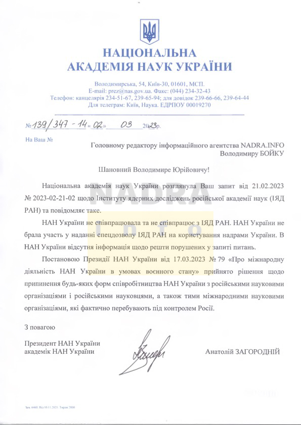 Не розповіли нічого про підземну діяльність російських науковців і в Національній академії наук України. Кажуть, з науковцями ІЯД РАН не співпрацювали і до повномасштабного вторгнення, а в березні припинили будь-яке співробітництво з усіма структурами РАН: