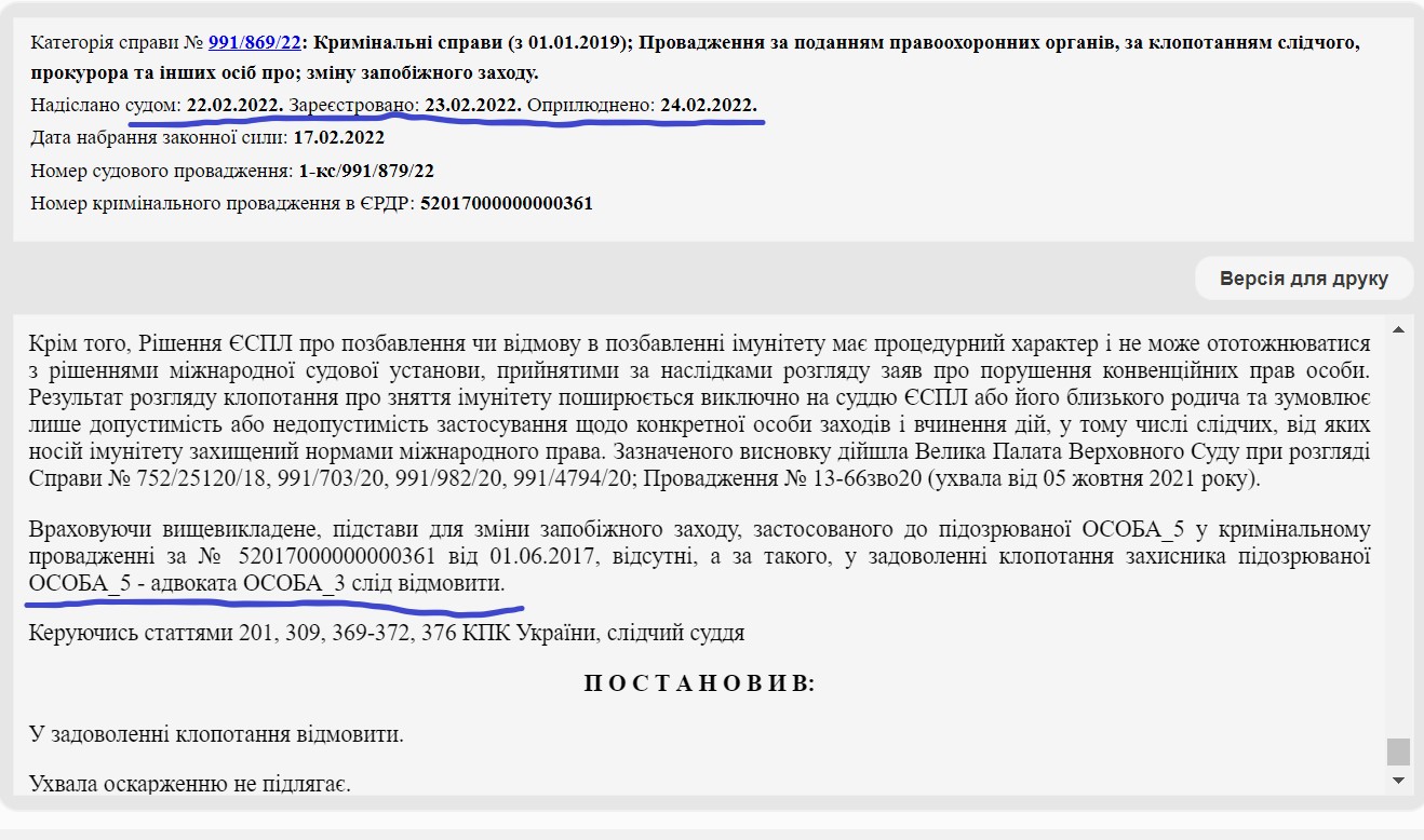 Останнє засідання з даного кримінального провадження датується 17 лютого 2022 року. Відповідно до цієї постанови Вищий антикорупційний суд не змінив запобіжний захід для колишньої першої заступникки міністра юстиції Наталії Бернацької, яку НАБУ та САП підозрювали у причетності до заволодіння понад 54 мільйонами гривень з державного бюджету.