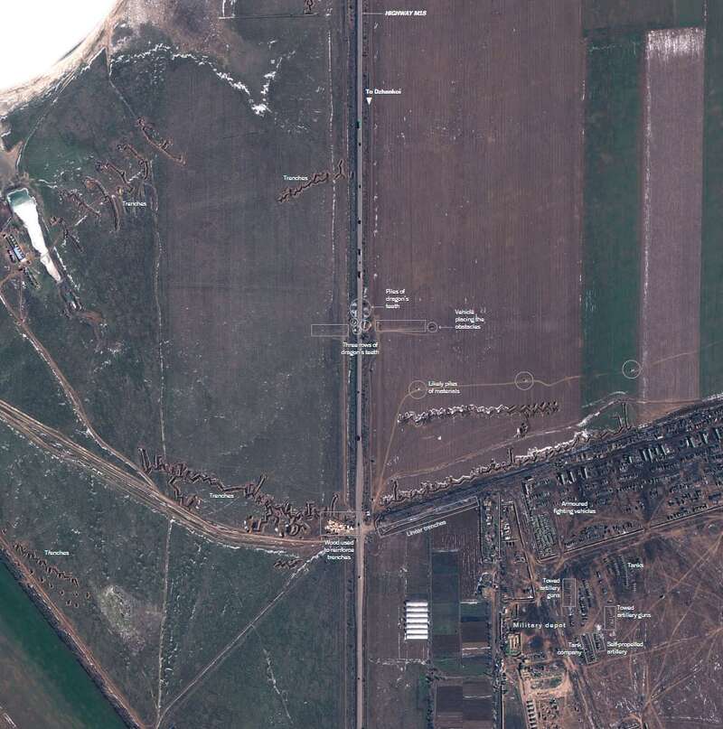 Також лише за кілька тижнів Росія побудувала кілометри укріплень біля Вітіно, міста на західному узбережжі Криму, хоча аналітики кажуть, що морська атака є малоймовірною.