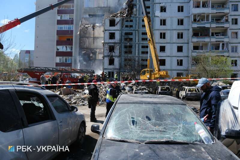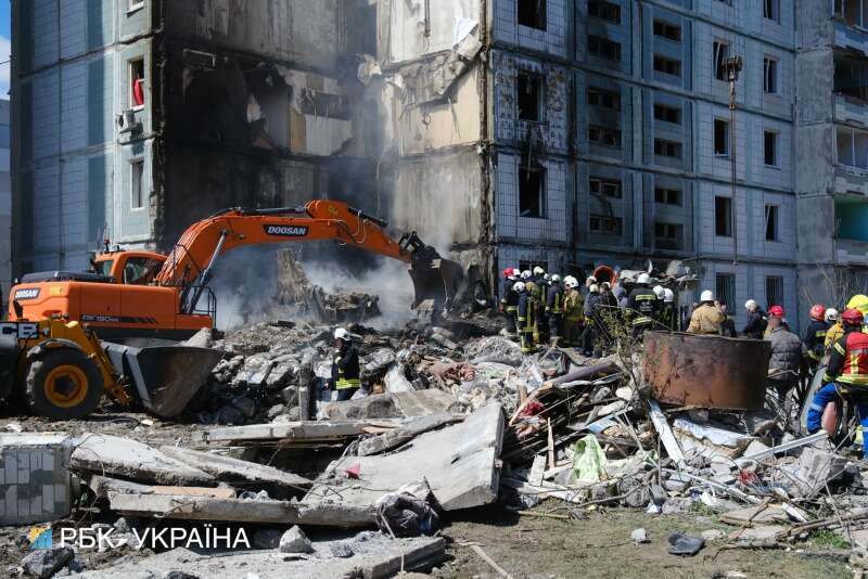 Кореспондент РБК-Україна повідомляє, що рятувальники все ще розбирають завали пошкодженого будинку. Російська ракета зруйнувала практично цілий під’їзд. Залишки завалів продовжують горіти. Крім того, вибухом повибивало вікна в сусідніх будинках.