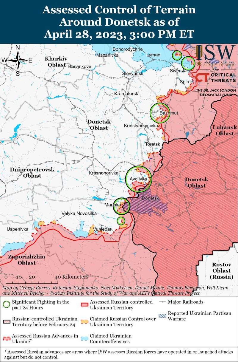 "Інститут вивчення війни" (США) проаналізував фото та відео з фронту. Кадри, опубліковані 28 квітня, показують, що російські війська просуваються під Кремінною. На фото армію РФ видно приблизно за 10 кілометрів на північний захід від міста.