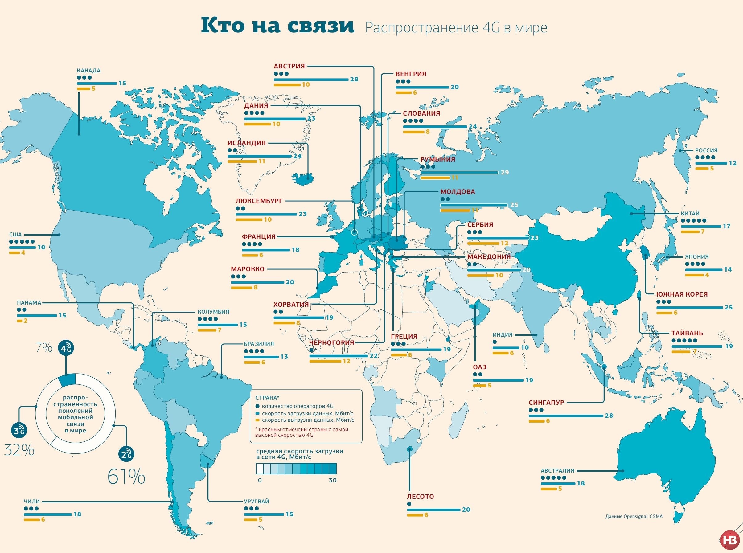 В России LTE представляют четыре оператора. Правда, скорость там намного ниже — в среднем 12 Мбит / с на скачивание и 5 Мбит / с на выгрузку.