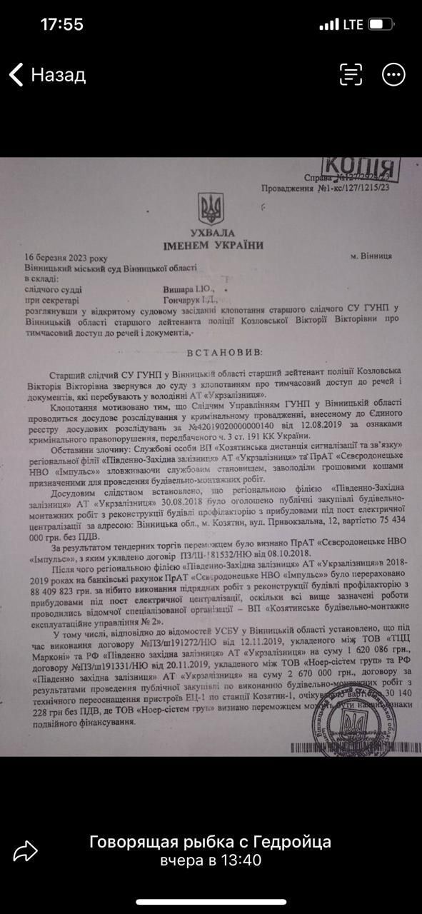 Згідно з матеріалами розслідування у справі №127/2924/23, службові особи "Козятинської дистанції сигналізації та зв’язку" регіональної філії "Південно-Західна залізниця", зловживаючи службовим становищем, заволоділи бюджетом на ремонтні роботи ЄЦ-1 на станції Козятин-1. 75,4 млн. грн. перевели НВО "Імпульс" за роботи, які раніше вже провели залізничники. При цьому співробітники УЗ вважають, що Букін має зв’язки з "Імпульсом", принаймні він часто приїжджав на підприємство на мотрисі.