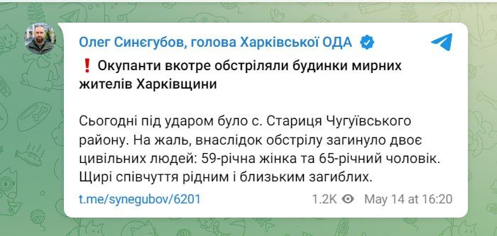 На жаль, внаслідок обстрілу загинули дві цивільні особи: 59-річна жінка та 65-річний чоловік.