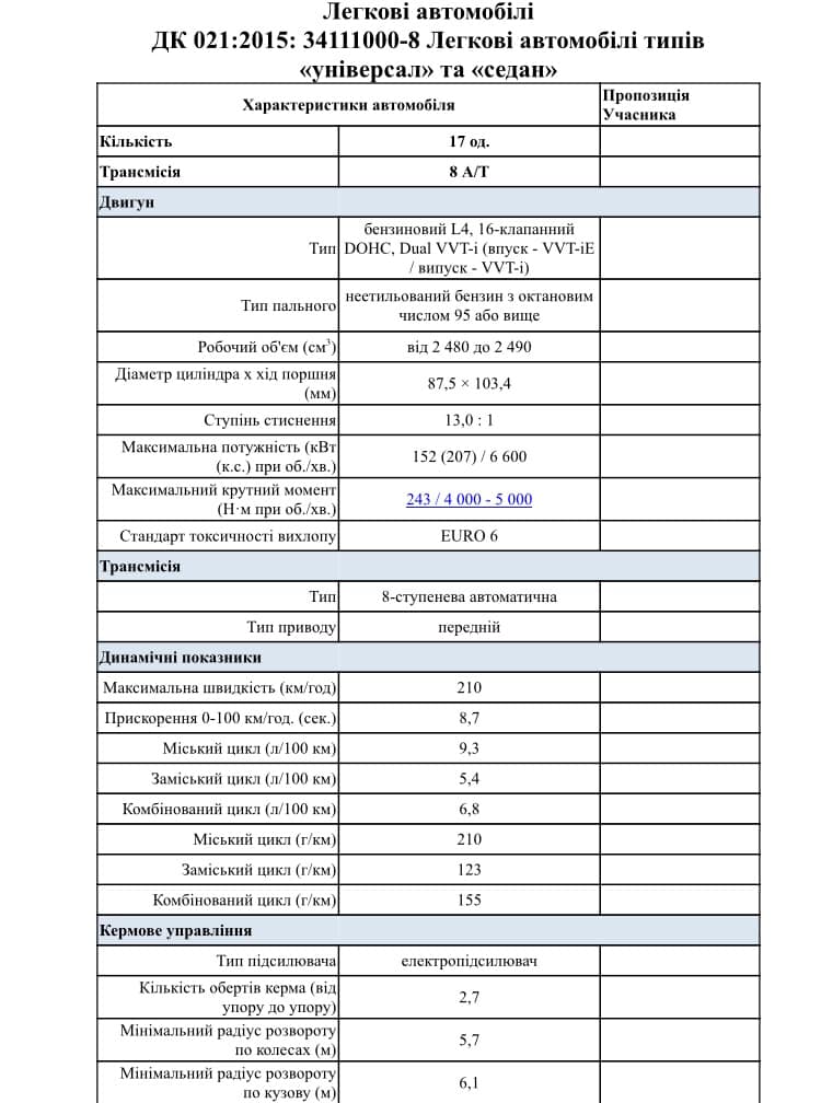 Комунальне підприємство (КП) “Автотранспортне підприємство КМДА” планує заключити договір з ТОВ “Віді Автострада” на закупівлю 17 легкових автомобілів, за які заплатять 20 млн 28 тис. 822 гривень. Ймовірно, КП закупить 17 автомобілів Toyota Camry.