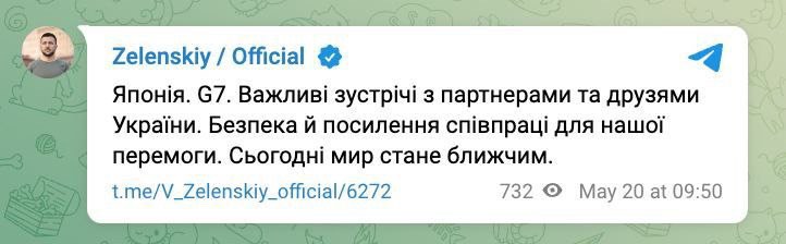 "Японія. G7. Важливі зустрічі з партнерами та друзями України. Безпека й посилення співпраці для нашої перемоги. Сьогодні мир стане ближчим", - зазначив президент.