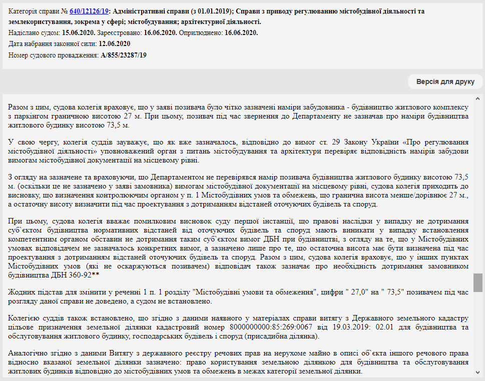 Зазначимо, паралельно з цим один з вищезгаданих активістів, Сергій Румянцев, намагався в судовому порядку добитися скасування виданих чиновниками МУО. Свої вимоги він пояснював, зокрема, невідповідністю цільового призначення ділянки на вул. Петропавлівській, 22-24 намірам забудови. Також він вказував на те, що, відповідно до норм ДБН, на землі з “тодішнім” цільовим призначенням можливе будівництво споруд не вище 4 поверхів. Втім, суди всіх трьох інстанцій були на стороні Департаменту містобудування та архітектури КМДА – крапка у цій справі була поставлена 1 грудня 2021 року Касаційним адмінсудом.