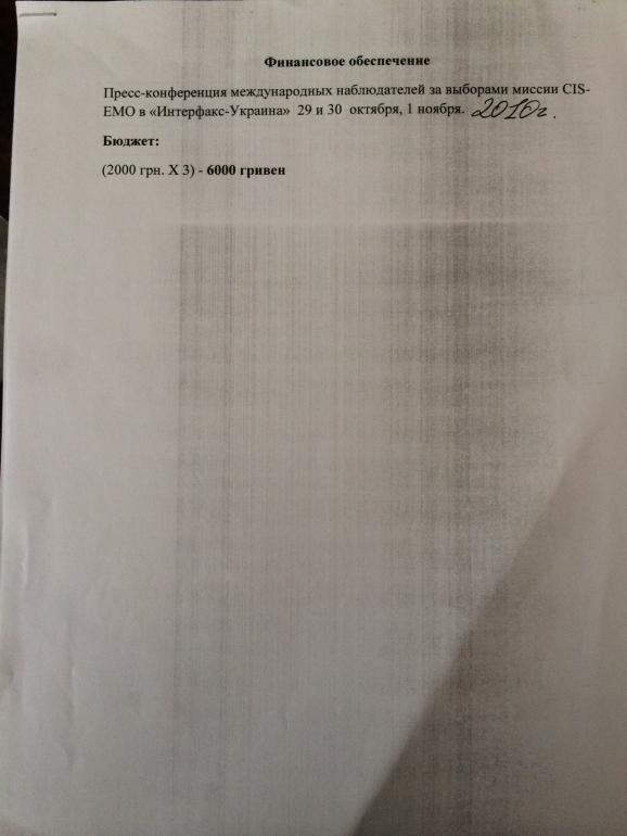 Крім того, в розпорядженні Еспресо.TV є документи, з яких видно, що саме Партія регіонів взяла на себе всі витрати делегації від CIS-EMO під час місцевих виборів-2010 в Україні та оплатила декілька проміжних та підсумкову прес-конференції за їхньою участю.