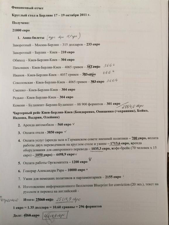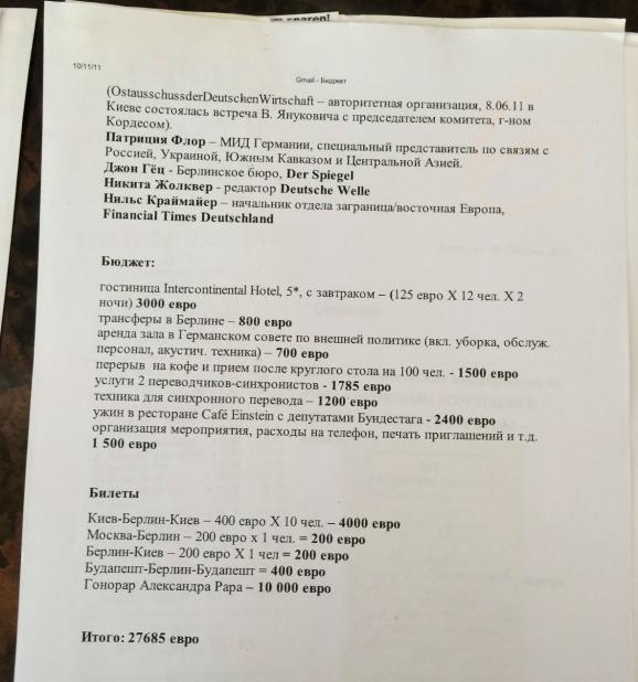 Під час круглого столу «Проблеми корупції в Україні та шляхи боротьби з нею, роль ЗМІ в цьому» в Берліні, левова доля витрат (10 тис. євро) прийшлася на оплату послуг німецького політолога, відомого пропагандиста Кремля Олександра Рара. Тут слід звернути увагу на те, що круглий стіл проходив 17-19 жовтня 2011 року, буквально через декілька днів після оголошення вироку Юлії Тимошенко. Крім того, напередодні стало відомо про скасування візиту президента Януковича до Брюсселя. Тому ще до початку дискусії було зрозуміло , що мова піде не тільки про боротьбу з корупцією на Україні і послуги Рара були як ніколи на часі.
