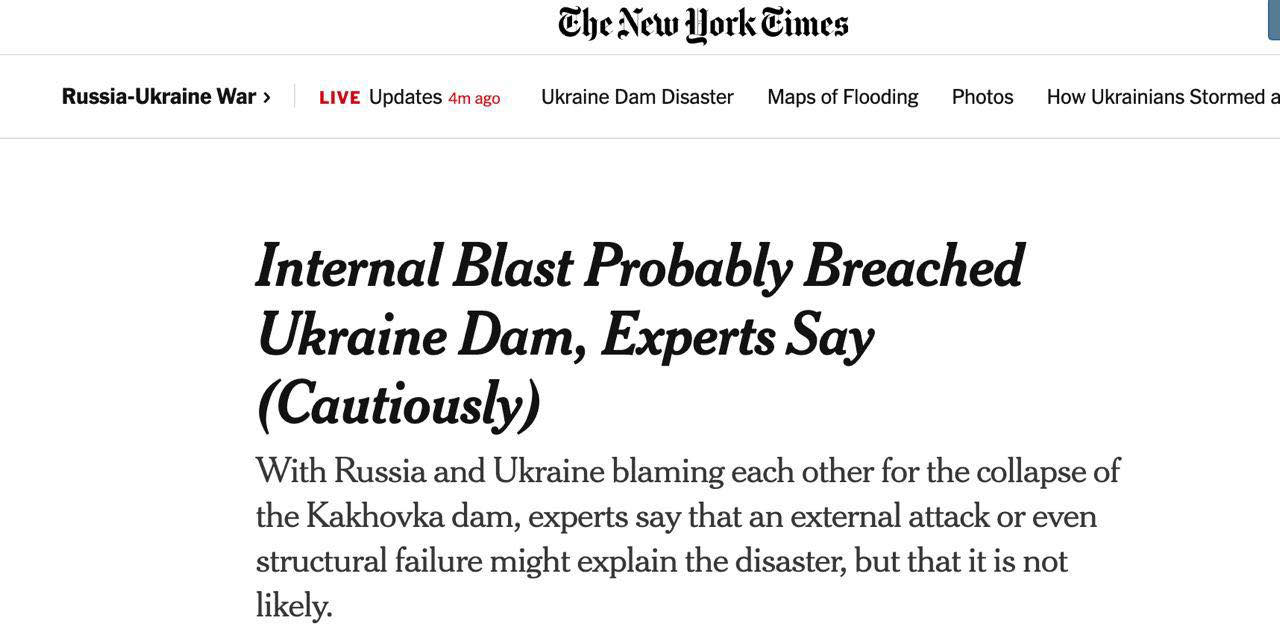 Як зазначає видання, воно попросило експертів із інженерної справи та боєприпасів прокоментувати вчорашній інцидент на Каховській ГЕС. Вони зазначають, що доказів поки що мало, але руйнування греблі міг викликати лише внутрішній підрив.