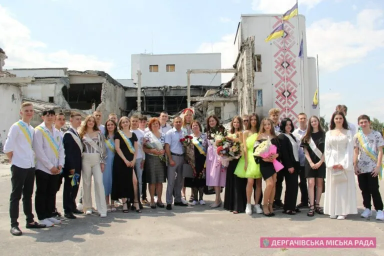 У місті Дергачі Харківської області учні ліцею №2 провели зворушливий випускний в умовах повномасштабної війни. Вручення атестатів організували в одному з бомбосховищ, а вальс діти станцювали біля руїн Будинку культури, знищеного російською ракетою.