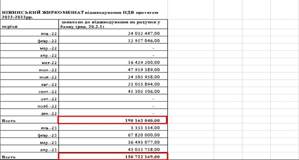 В листопаді 2022 року телеграм-канал «Дон Кихот», який анонімно ведуть колишні податківці, повідомив, що підприємство з орбіти братів Клюєвих ПрАТ «Ніжинський Жиркомбінат» отримало з державного бюджету відшкодування ПДВ на суму 107 мільйонів гривень. Пізніше журналісти актуалізували інформацію. Виявилось, що повна сума отриманого відшкодування ПДВ за 2022 рік склала 190 мільйонів гривень, а з січня по квітень 2023 року – більше 150 млн грн. Таким чином, менш, ніж за півтора роки, жиркомбінат Клюєвих отримав з бюджету 340 млн гривень! Ця ж інформація є у відкритому доступі на сайті проекту Clarity-Project в розділі «Податки. Відшкодування ПДВ».