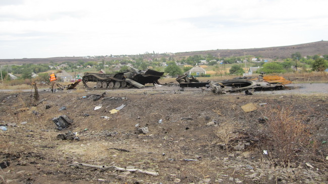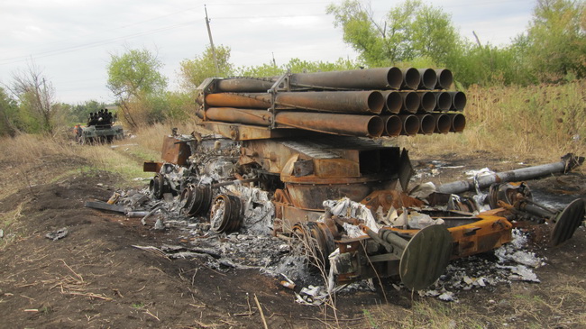 Еще несколько слов - о двух уничтоженных артиллерийских системах залпового огня «Ураган», которые стоят рядом с деревней Кутейниково - неподалеку от Иловайска. Сепаратисты охотно водят туда журналистов и туристов, рассказывая, будто именно из этих «Ураганов» украинская сторона обстреливает мирные города Донбасса. Но на «Ураганах» - остатки свежей краски специфического зеленого оттенка - присущего российской военной технике. А если прикинуть по карте - куда эти «Ураганы» стреляли, то становится понятным, что их целью была украинская колонна, которая выходила из Иловайского котла урочищем Красная поляна.