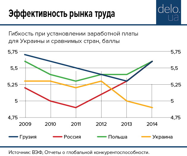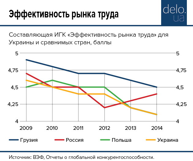 Эффективность рынка труда Украины стремительно падает. Еще в 2009 году страна занимала 49-е место по этому показателю, а в 2013-м — оказалась на 84-й позиции (сегодня — 80-е место). Существенно упали балльные оценки нашего рынка рабочей силы (с 4,6 балла в 2009 году до 4,1 в 2014-м), что означает, что рынок труда перестал быть конкурентным преимуществом Украины.