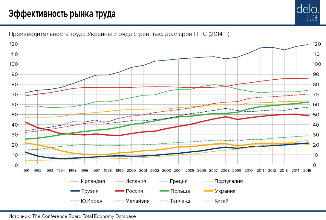 В связи с созданием зоны свободной торговли Украины с Евросоюзом стоит также посмотреть на производительность труда в Украине в сравнении с проблемными экономиками ЕС, так называемой группой PIGS. Итак, производительность труда выше украинской у Португалии в 3,2 раза, у Греции — в 3,7, у Испании — в 4,3, а у Ирландии — в 6 раз. Причем эти страны, исключая разве что Грецию, демонстрируют долгосрочные тенденции прироста уровня производительности.