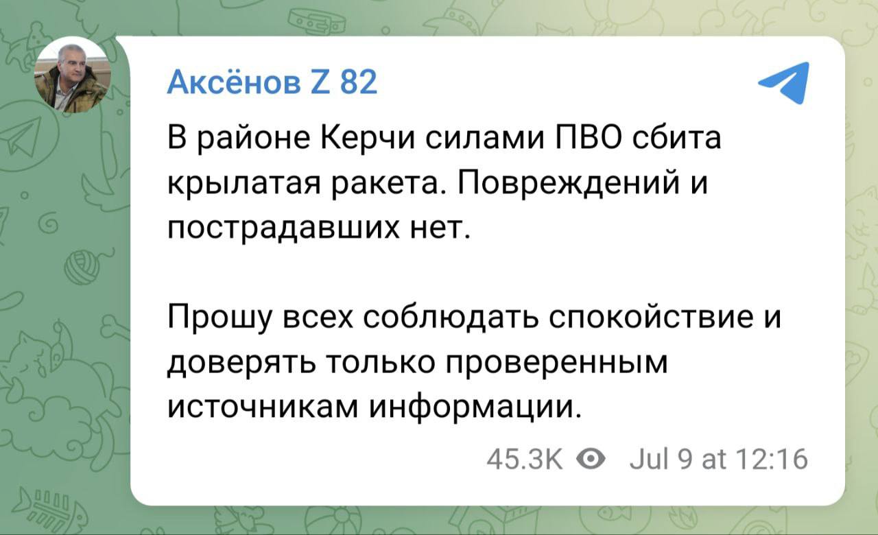 "У районі Керчі силами ППО збита крилата ракета. Пошкоджень і постраждалих немає. Прошу всіх зберігати спокій та довіряти лише перевіреним джерелам інформації", - написав колаборант о 12:16.
