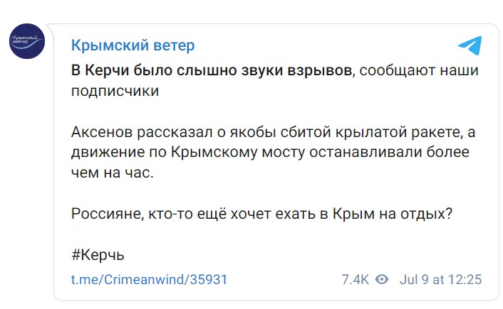 Тим часом жителі Керчі повідомляли про вибухи, які, схоже, прогриміли вже після "вдалої роботи російської ППО". Відповідні повідомлення з’явилися у каналі "Кримський вітер" о 13.25.