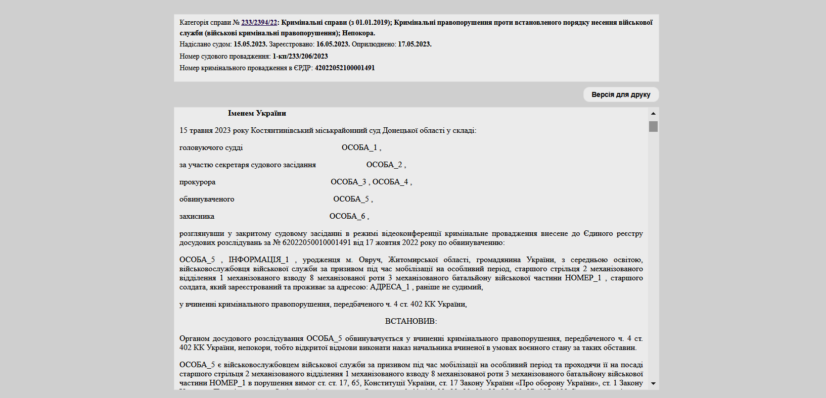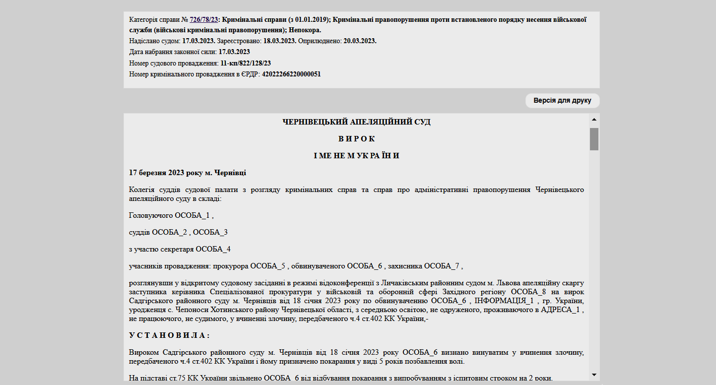 Є вирок Чернівецького апеляційного суду за березень, коли солдат-контрактника посадили на 5 років, змінивши рішення першої інстанції. Як сказано в рішенні суду, солдата викликали для оголошення наказу. Там сиділи три чи чотири офіцери, тобто вони вже готувалися до передання справи в Державне бюро розслідувань, щоб це всі засвідчили, склали рапорти й акт. Так зафіксовано, що солдат відмовився виконувати наказ “із хибно зрозумілих інтересів служби”.