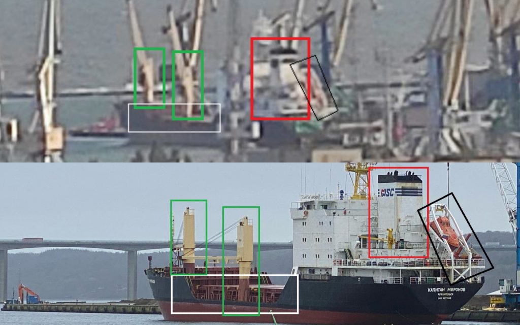Порівняння судна на світлинах з сайту marinetraffic.com і від мешканців м.Бердянська, зроблених у травні – червні 2023 року, колаж investigator.org.ua