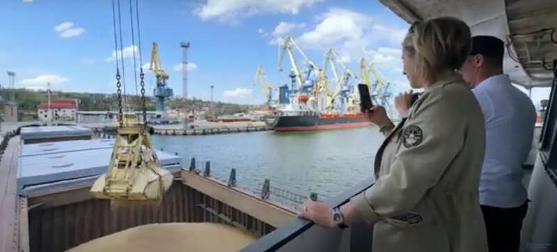 Юлія Максімова в порту тимчасово окупованого Маріуполя фотографує крадіжку зерна, весна 2023 р., скриншот з відео на YouTube-каналі РосКапСтрой