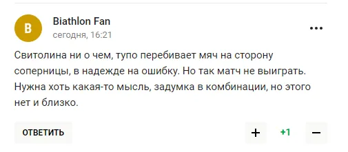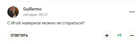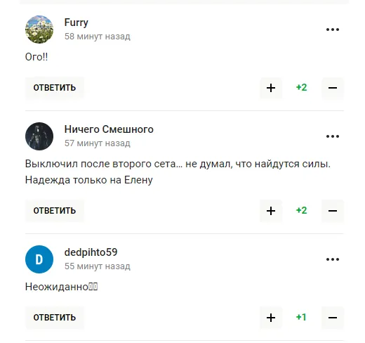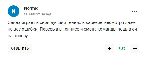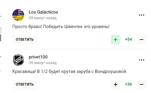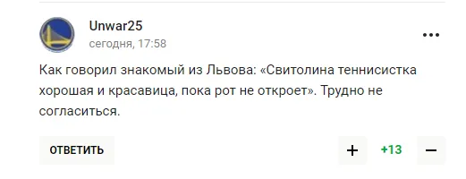 "Світоліна ні про що, тупо перебиває м’яч на бік суперниці, сподіваючись на помилку. Але так матч не виграти. Потрібна хоч якась думка, задум у комбінації, але цього немає і близько", - пишуть любителі тенісу з РФ.