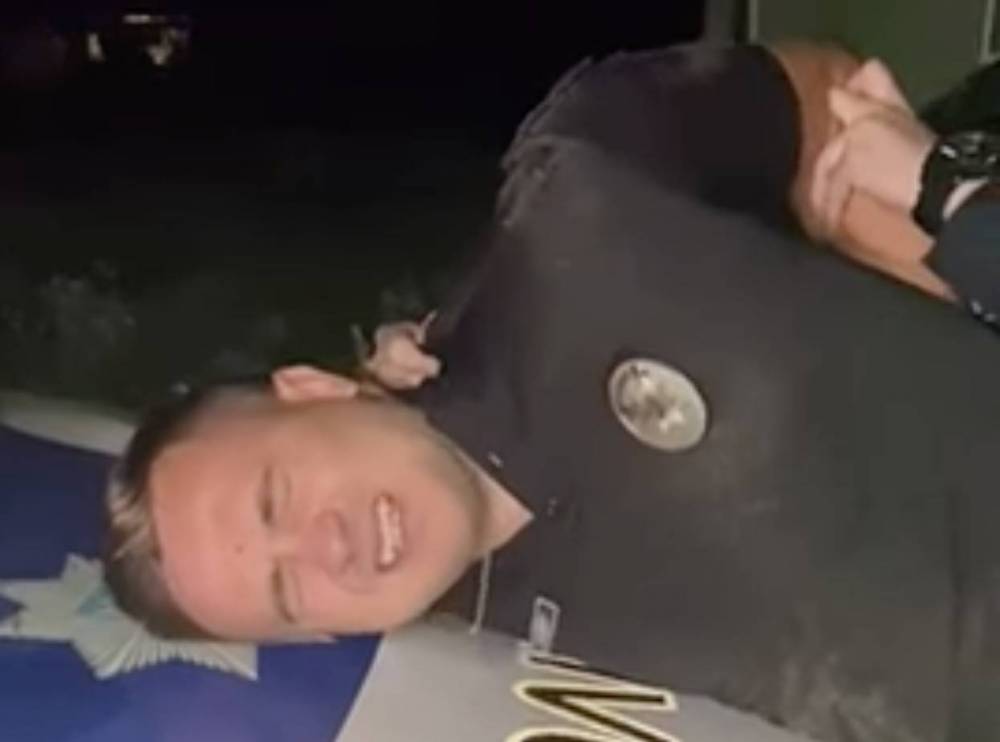 На ще одному відео видно, що поліцейського вже затримали, а він б’ється головою в капот службової машини.