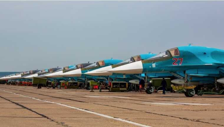 Літаки, що знаходяться на аеродромі в Єйську, включають винищувачі-бомбардувальники Су-34, багатоцільові винищувачі Су-35/30, Су-27, а також винищувач МіГ-29.