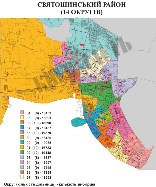 В Святошинском районе столицы ТИК определил 14 округов, в рамках которых будут задействованы 127 избирательных участков для около 254 335 тыс. голосующих жителей столицы.
